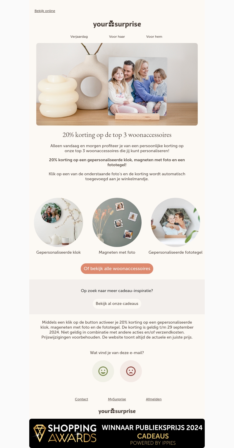 Alleen vandaag en morgen ontvang je 20% korting op drie prachtige woonaccessoires die je kunt personaliseren. Kies uit een klok, magneten of een fototegel en geef je huis een persoonlijke touch. Mis deze kans niet om jouw interieur te verfraaien met unieke items.
