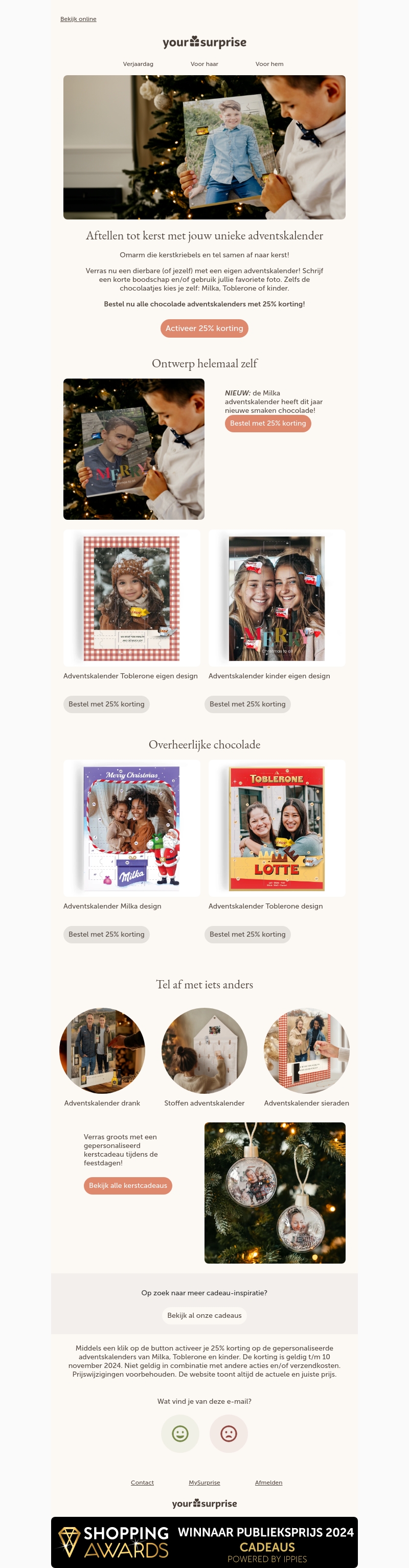 Tel af naar Kerst met een persoonlijke adventskalender van YourSurprise. Ontwerp je eigen kalender en kies uit verschillende chocolademerken zoals Milka en Toblerone. Profiteer nu van 25% korting op al je bestellingen. Deze unieke adventskalenders zijn perfect als cadeau voor jezelf of een dierbare. De actie is geldig tot en met 10 november 2024.