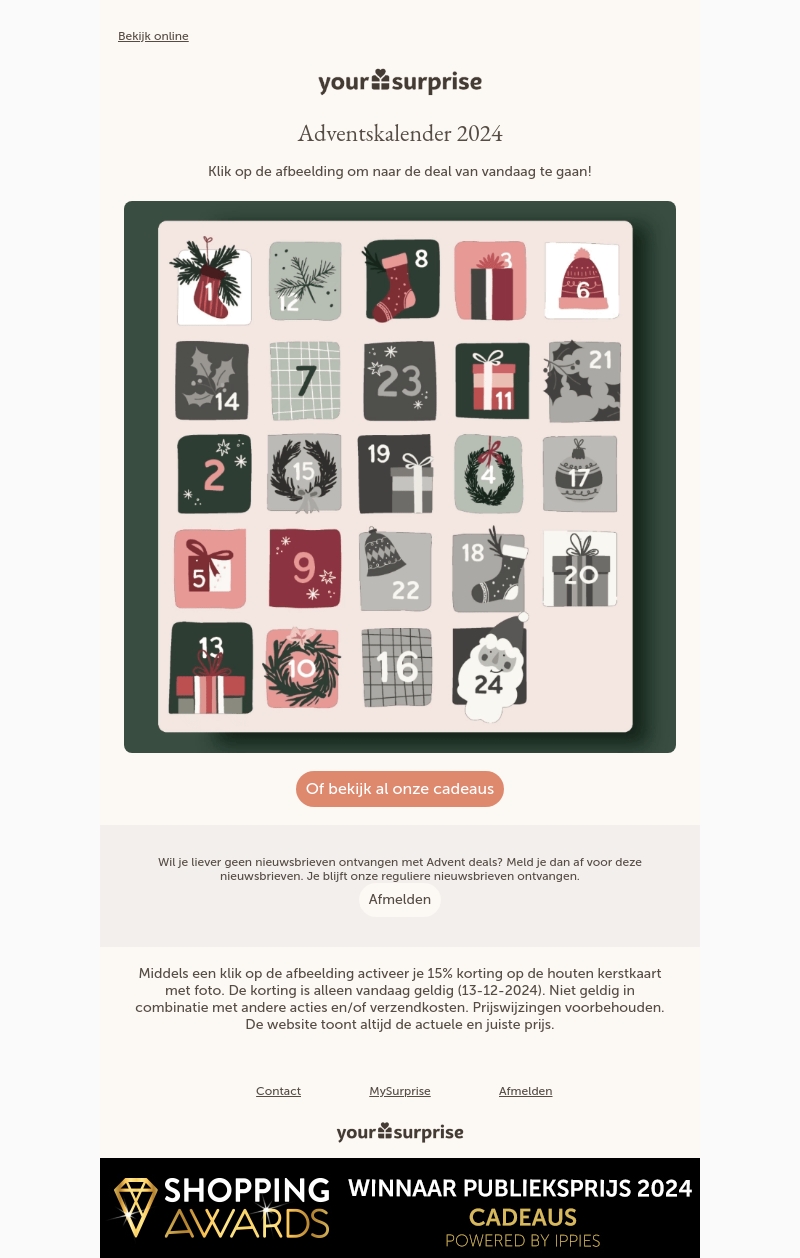 Vier de feestdagen met onze adventskalender! Vandaag, op dag 13, bieden we een exclusieve korting van 15% op houten kerstkaarten met foto. Grijp deze kans om uw favoriete herinneringen vast te leggen en te delen. De actie is alleen geldig op 13-12-2024, dus mis het niet! Bekijk ons volledige assortiment en vind het perfecte cadeau. Korting niet geldig in combinatie met andere acties.