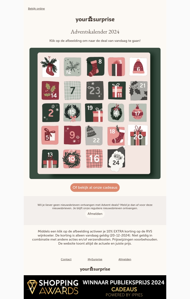Vandaag is het de 20e dag van de Adventskalender bij Your Surprise! Ontvang een unieke persoonlijke gravure op een prachtig cadeau. Mis deze exclusieve aanbieding niet. Klik op de afbeelding om de deal van vandaag te activeren. Geniet van de feestelijke sfeer met onze speciale kerstdeals. Meld je aan voor onze nieuwsbrief en blijf op de hoogte.