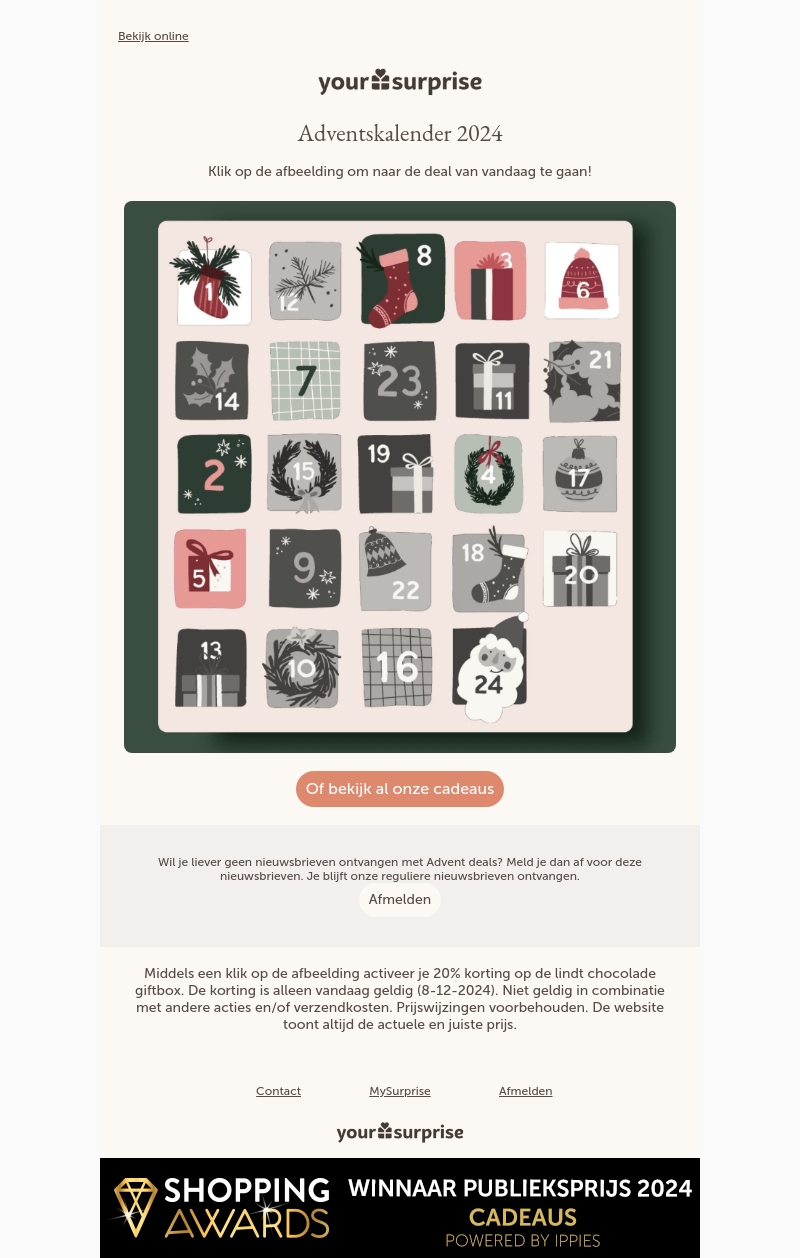 Vier de feestdagen met onze spannende Adventskalender aanbiedingen! Vandaag, op dag 8, hebben we iets speciaals voor de echte chocoladeliefhebbers onder ons. Activeer je 20% korting op Lindt chocolade cadeauverpakkingen. Wees snel, de korting is alleen geldig op 8 december 2024. Bekijk de afbeelding en geniet van jouw zoete verrassing.