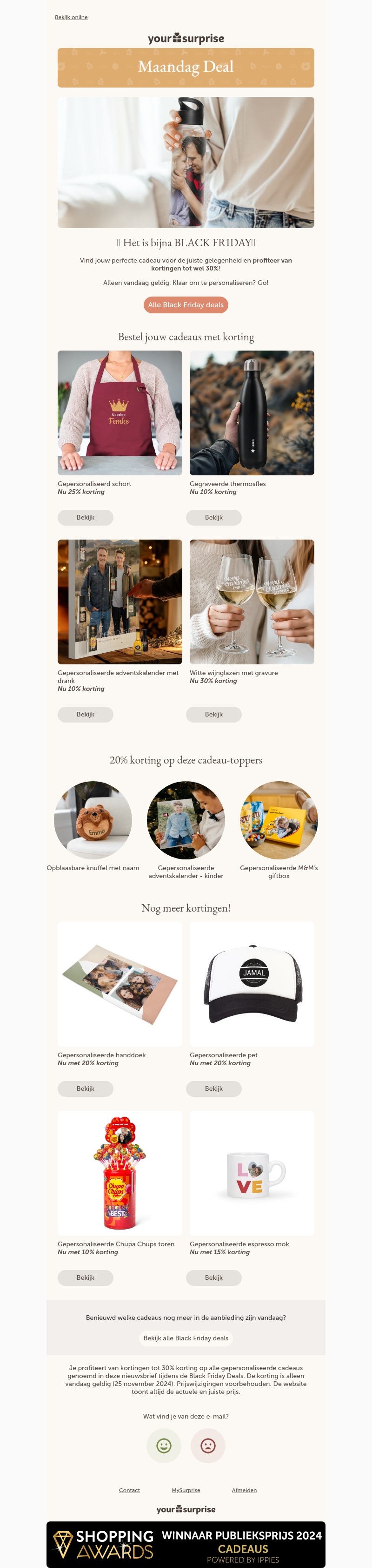 Verras jezelf en je geliefden met gepersonaliseerde cadeaus en geniet van Black Friday Deals met kortingen tot wel 30%. Deze aanbiedingen zijn slechts één dag geldig, dus profiteer snel. Ontdek diverse cadeau-opties zoals thermosflessen, adventskalenders en meer.