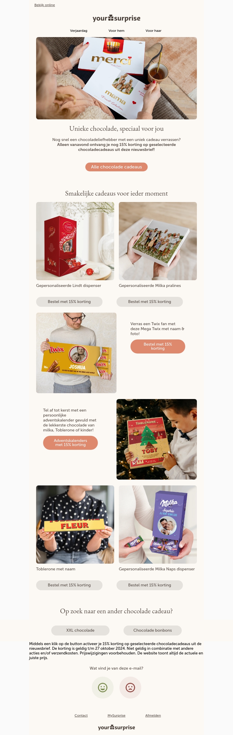Mis het niet: 15% korting op de lekkerste chocoladecadeaus! Verras je geliefden met gepersonaliseerde Lindt dispensers, Milka pralines en meer. Ontvang deze exclusieve korting alleen vanavond voor unieke cadeaus.