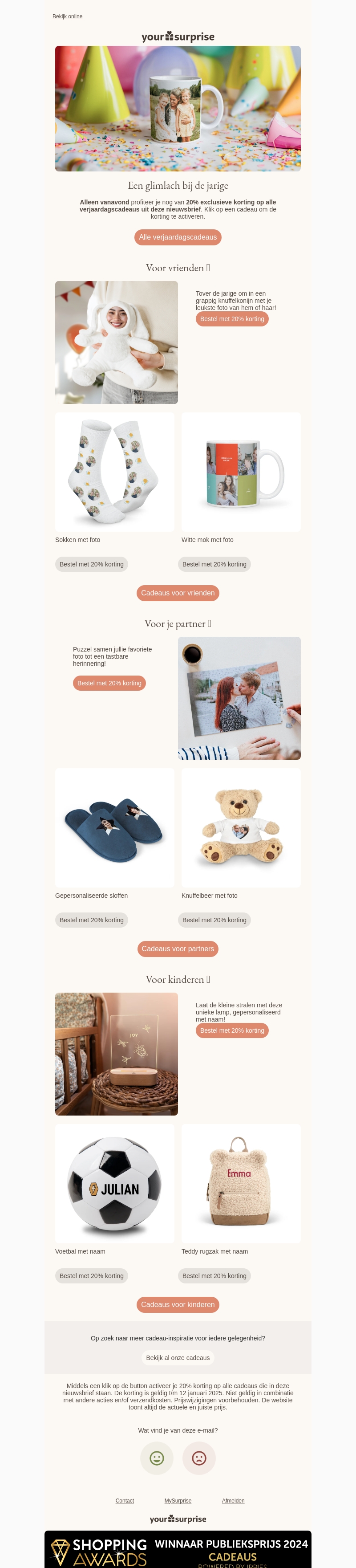 Profiteer alleen vanavond nog van 20% korting op de leukste verjaardagscadeaus. Of je nu op zoek bent naar een grappige knuffel, gepersonaliseerde mok of uniek nachtlampje, YourSurprise heeft het allemaal. Verwen je vrienden, partner of kinderen met een cadeau dat hun naam draagt. De korting is geldig tot middernacht, dus wacht niet te lang!