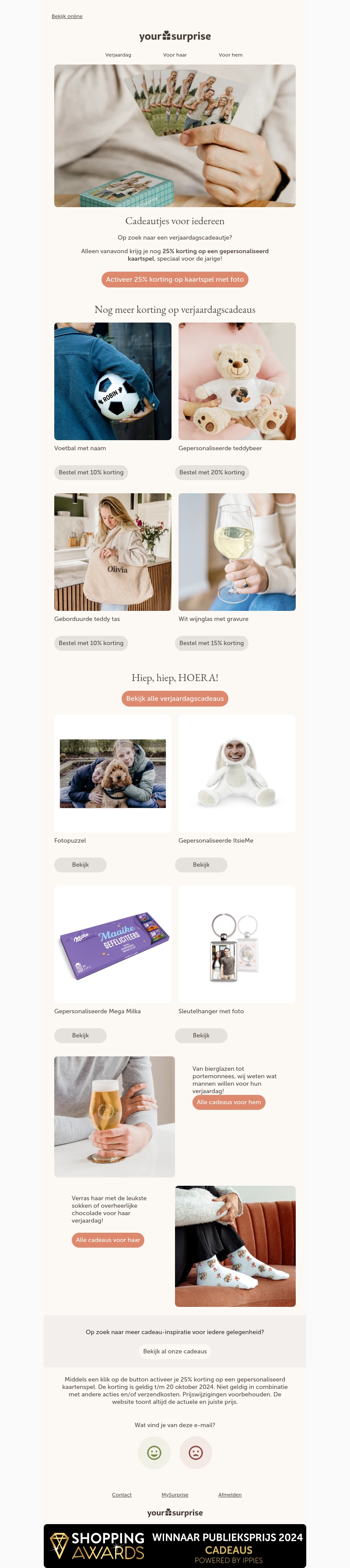 Ontvang vanavond nog 25% korting op een gepersonaliseerd kaartspel met eigen foto. Dit is de perfecte kans om een uniek verjaardagscadeau te scoren dat speciaal is aangepast voor de jarige. Naast het gepersonaliseerde kaartspel zijn er ook andere leuke cadeau-opties beschikbaar zoals een teddy tas of een wijnglas met gravure. Mis deze exclusieve aanbieding niet, geldig tot eind oktober. Bekijk het volledige aanbod voor meer inspiratie.