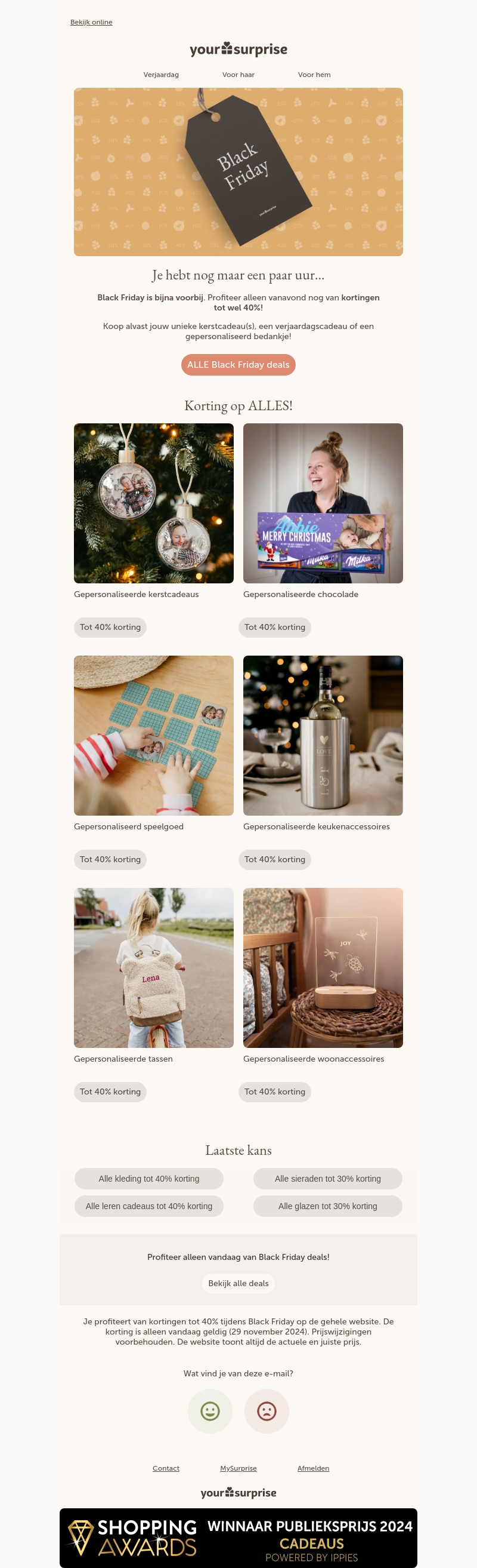 Mis deze kans niet om unieke geschenken met maar liefst 40% korting te bemachtigen! Van kerstcadeaus tot gepersonaliseerde chocolade, speelgoed, en meer, vind alles wat je nodig hebt voor de feestdagen. Deze aanbieding is alleen vandaag geldig. Zorg dat je de beste deals krijgt voordat het te laat is. Koop nu en verras je geliefden!