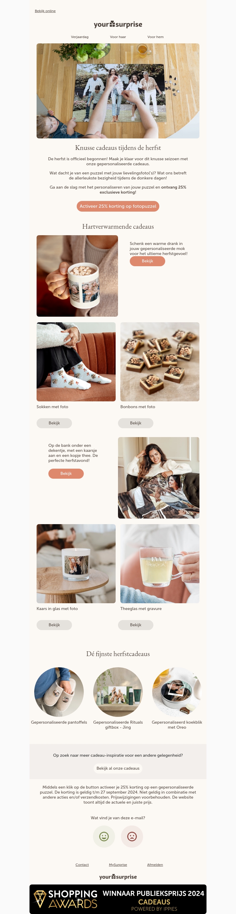 De herfst is begonnen en wij hebben de perfecte knusse cadeaus voor jou. Van gepersonaliseerde fotopuzzels tot mokken en pantoffels. Profiteer van 25% exclusieve korting op jouw fotopuzzel. Ontdek onze hartverwarmende cadeaus en maak je herfst nog specialer.
