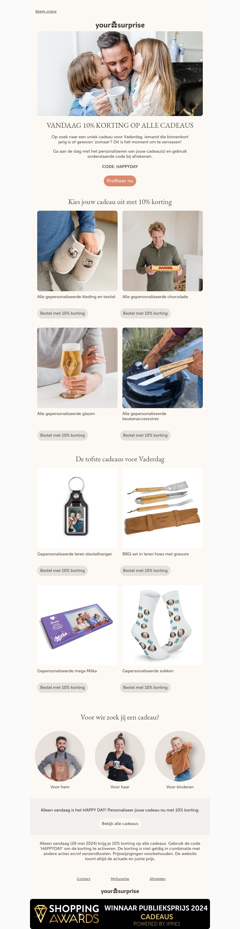 Op zoek naar een uniek cadeau voor Vaderdag of een andere gelegenheid? Ontvang vandaag 10% korting op alle gepersonaliseerde cadeaus bij YourSurprise! Gebruik de kortingscode HAPPYDAY bij het afrekenen om van deze aanbieding te profiteren.