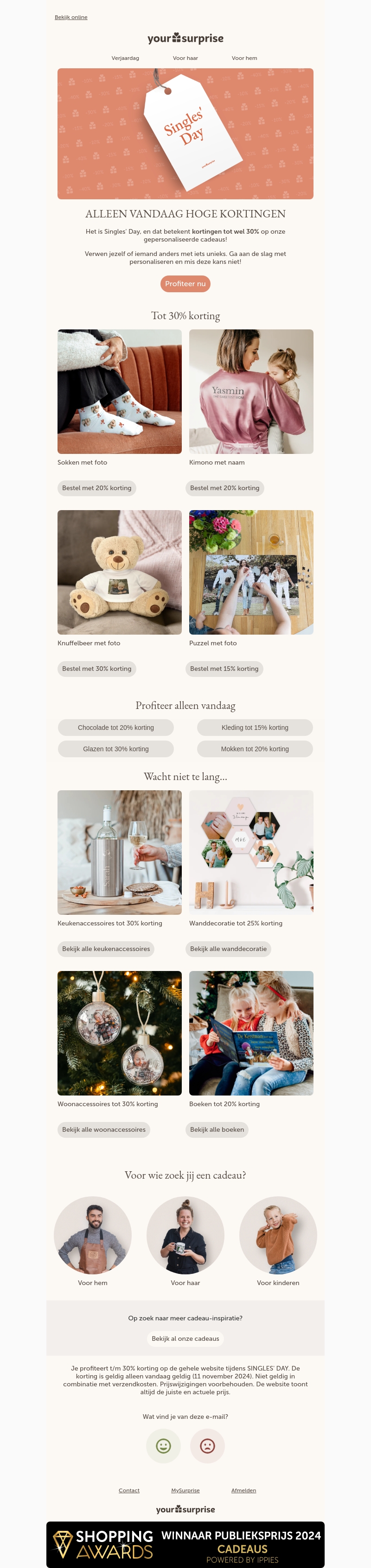 Vier Singles' Day met exclusieve kortingen tot 30% op gepersonaliseerde cadeaus. Alleen vandaag kun je genieten van deals op unieke items zoals sokken, kimono's, knuffelberen en meer. Mis deze kans niet om jezelf of een ander te verwennen met iets speciaals. Aanbiedingen bevatten ook kortingen op chocolade, kleding, glazen, en mokken. Begin met personaliseren en profiteer nu van deze geweldige deals.