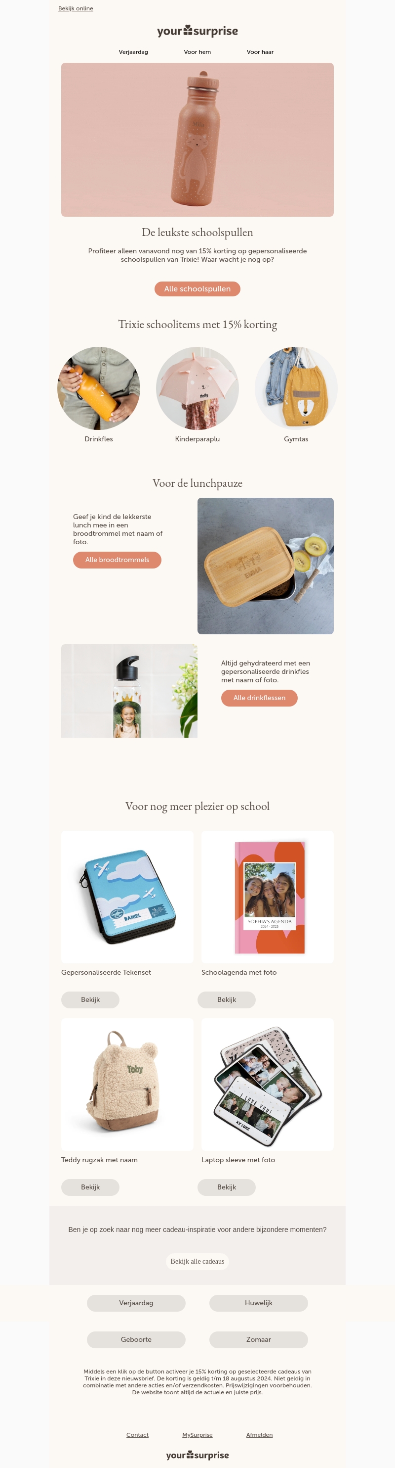 Profiteer van 15% korting op gepersonaliseerde schoolspullen van Trixie. Haal drinkflessen, broodtrommels, paraplu's en meer voor je kinderen. Zorg voor een geweldige start van het schooljaar met unieke en praktische items.