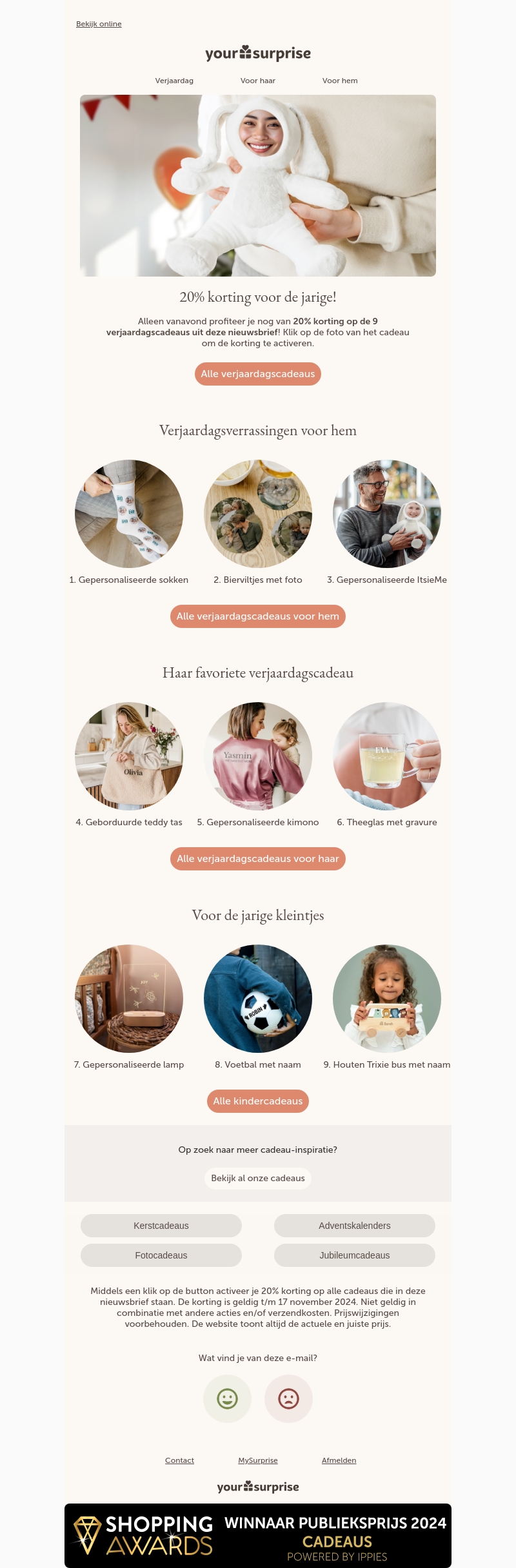 Ontdek de speciale verjaardagsaanbieding van YourSurprise met 20% korting op unieke cadeau-ideeën. Alleen vanavond kunt u profiteren van kortingen op gepersonaliseerde sokken, fotobierviltjes en meer. Perfect voor hem, haar en kinderen. Bekijk de uitgebreide selectie voor elk jarig type. Klik om de kortingsactie te activeren en maak uw cadeau extra bijzonder.