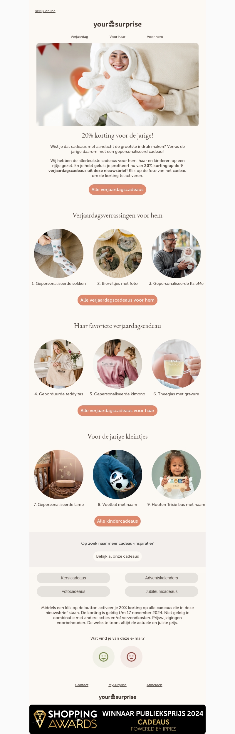 Verwen de jarige met een speciaal cadeau en geniet van 20% korting. Ontdek unieke en gepersonaliseerde cadeaus voor hem, haar of de kleintjes. Of het nu gaat om sokken met naam of een gepersonaliseerde kimono, wij hebben de perfecte verrassing. De korting is geldig tot en met 17 november. Activeren is simpelweg klikken. Mis deze kans niet op onvergetelijke geschenken!