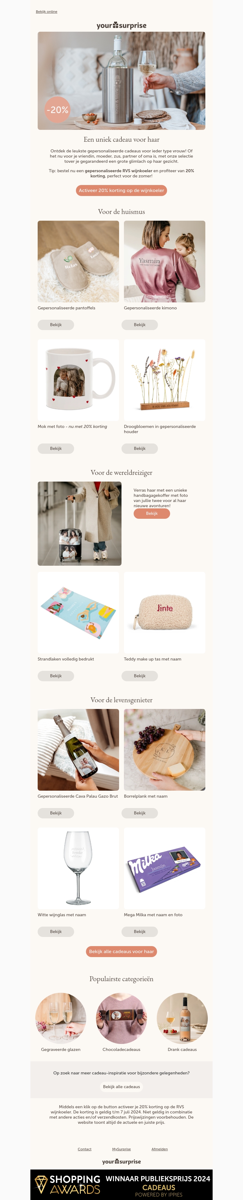 Ontdek de meest persoonlijke en unieke cadeaus voor elke speciale vrouw in jouw leven. Of het nu gaat om je vriendin, moeder, zus of partner, deze geschenken toveren gegarandeerd een glimlach op haar gezicht. Dit keer met een speciale aanbieding: profiteer van 20% korting op de RVS wijnkoeler.