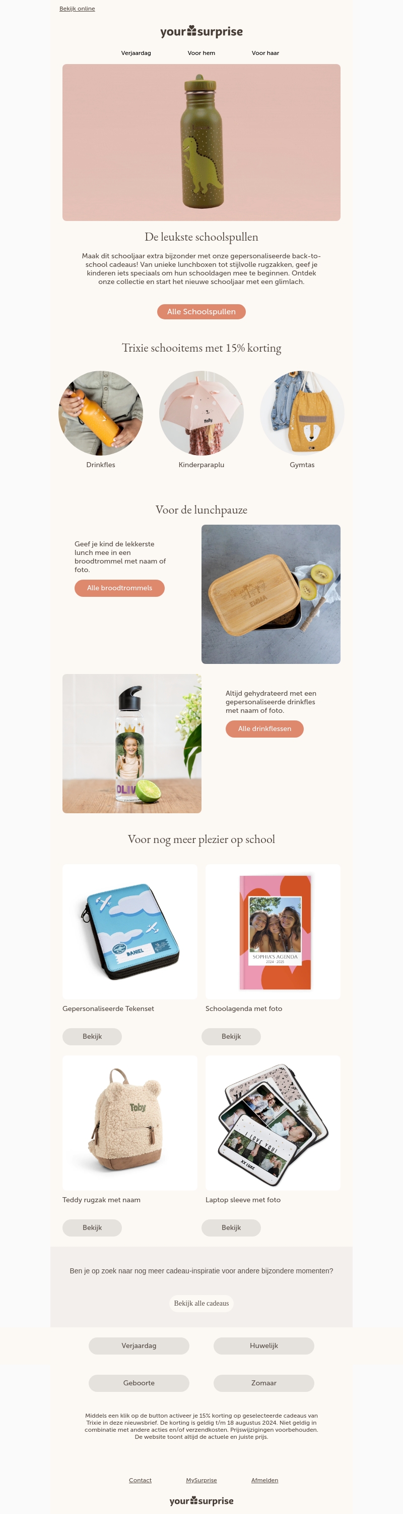Maak dit schooljaar extra bijzonder met onze gepersonaliseerde back-to-school cadeaus! Van unieke lunchboxen tot stijlvolle rugzakken, geef je kinderen iets speciaals om hun schooldagen mee te beginnen. Ontdek onze collectie en start het nieuwe schooljaar met een glimlach.