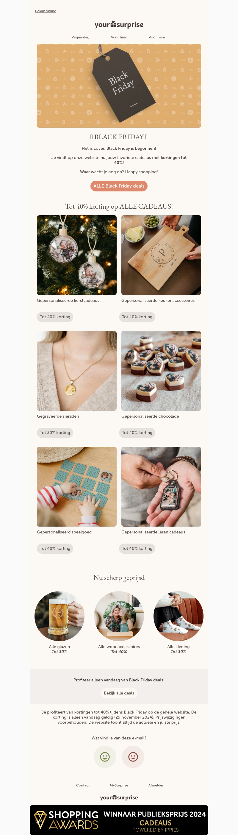 Mis deze kans niet om tot 40% te besparen op alle cadeaus tijdens de Black Friday actie van YourSurprise. Vind gepersonaliseerde geschenken voor elke gelegenheid, van kerstcadeaus tot sieraden, en meer. Deze aanbiedingen zijn alleen vandaag geldig. Shop nu en zorg voor onvergetelijke verrassingen tegen de beste prijzen.