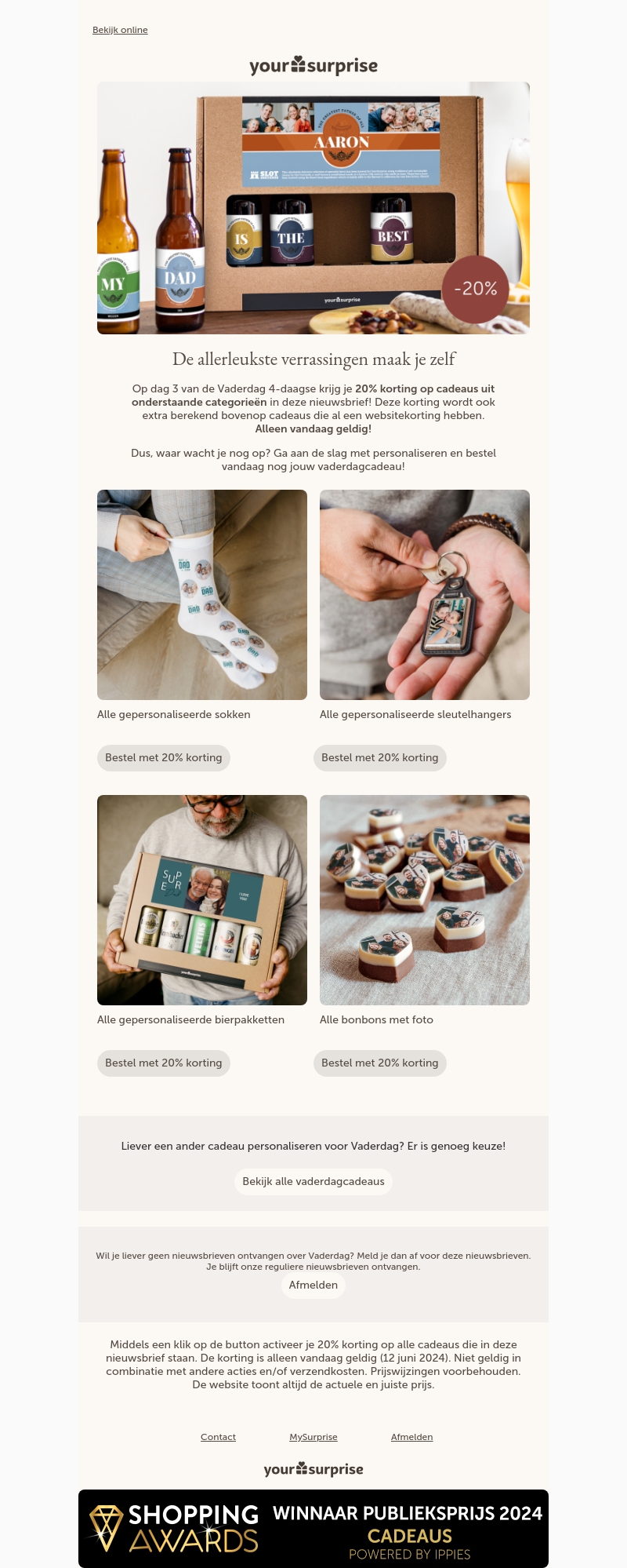 Op de 3e dag van de Vaderdag 4-daagse biedt YourSurprise 20% korting op cadeaus in geselecteerde categorieën. Personaliseer unieke cadeaus zoals sokken, sleutelhangers, bierpakketten en bonbons met foto's. Deze aanbieding geldt alleen vandaag!