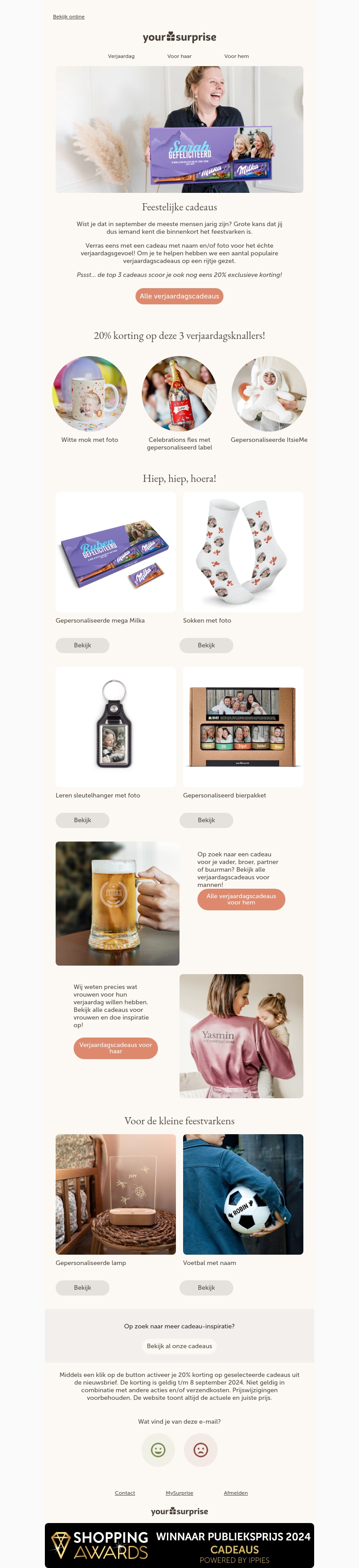 Feestelijke cadeaus met 20% korting! Verras het feestvarken met gepersonaliseerde items zoals mokken, sokken, chocolade en meer. Ontdek speciale cadeaupakketten en geniet van exclusieve kortingen.