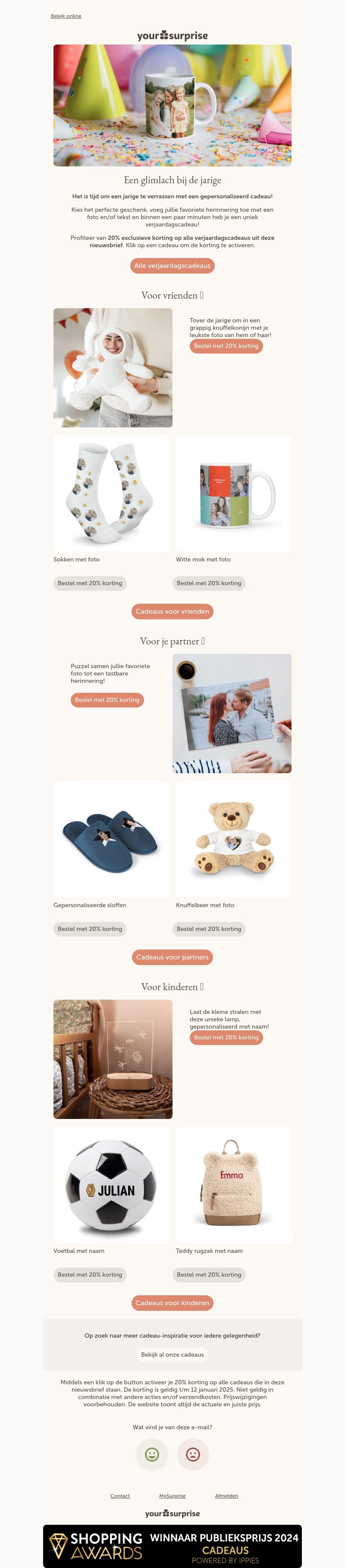 Verwen de jarige met een speciaal gepersonaliseerd cadeau. Of je nu op zoek bent naar cadeaus voor vrienden, je partner, of kinderen, bij YourSurprise vind je alles. Profiteer nu van 20% korting op unieke verjaardagscadeaus. Tover een glimlach op het gezicht van je geliefden met een persoonlijk tintje. Bekijk de nieuwsbrief en vind het perfecte geschenk. Mis deze kans niet om geliefden te verrassen!