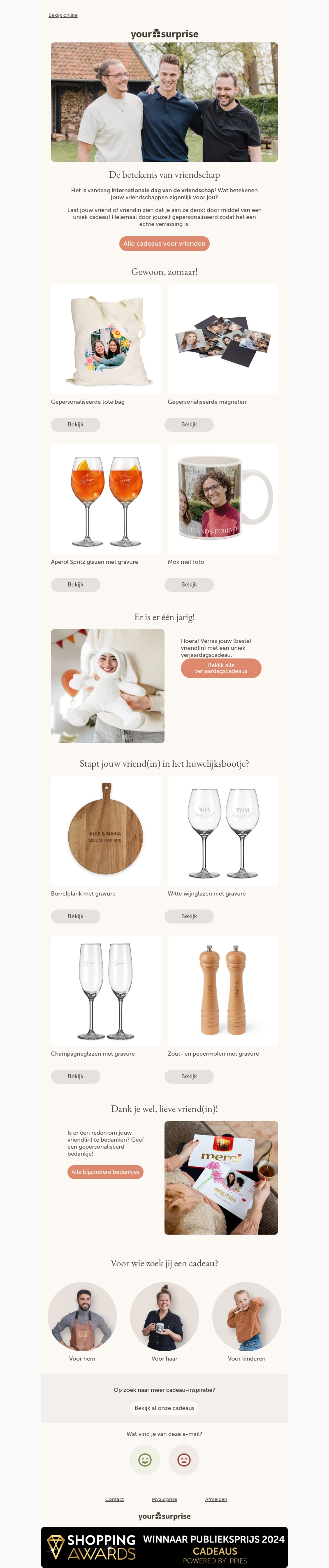 Het is vandaag Internationale Dag van de Vriendschap! Verras jouw vriend(in) met een uniek cadeau. Denk aan persoonlijke tote bags, mokken, wijnglazen en meer. Laat zien hoeveel jouw vriendschap betekent met een echte verrassing!