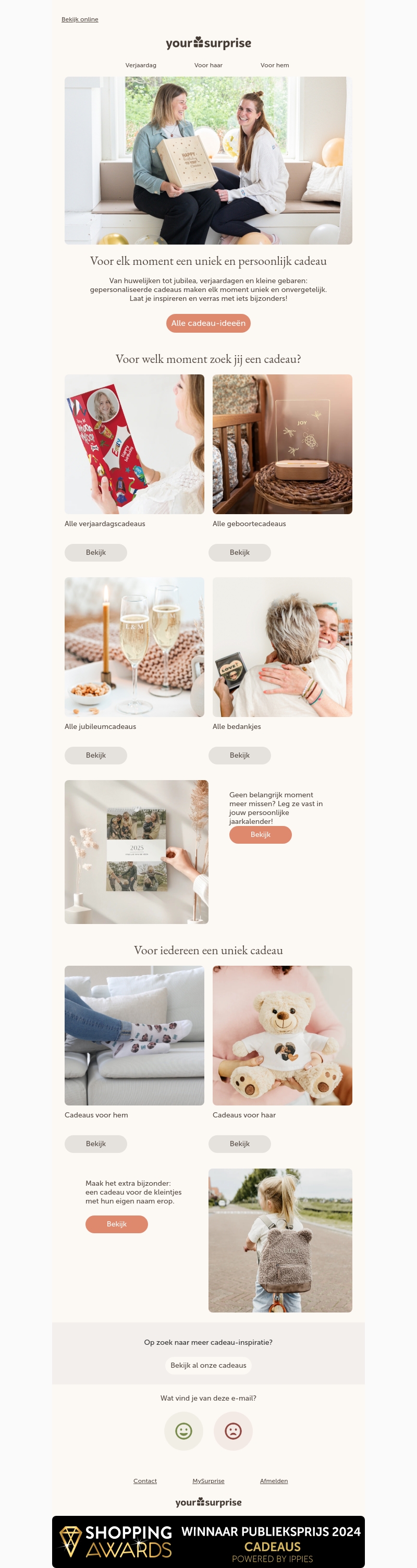 Bij YourSurprise vind je de meest unieke en persoonlijke cadeau-ideeën voor elk moment. Of het nu gaat om verjaardagen, jubilea of kleine bedankjes, we hebben voor iedereen iets bijzonders. Maak elk moment onvergetelijk met een gepersonaliseerd cadeau dat speciaal voor jou is gemaakt. Laat je inspireren en verras je geliefden met iets uniek en onvergetelijk in 2025.