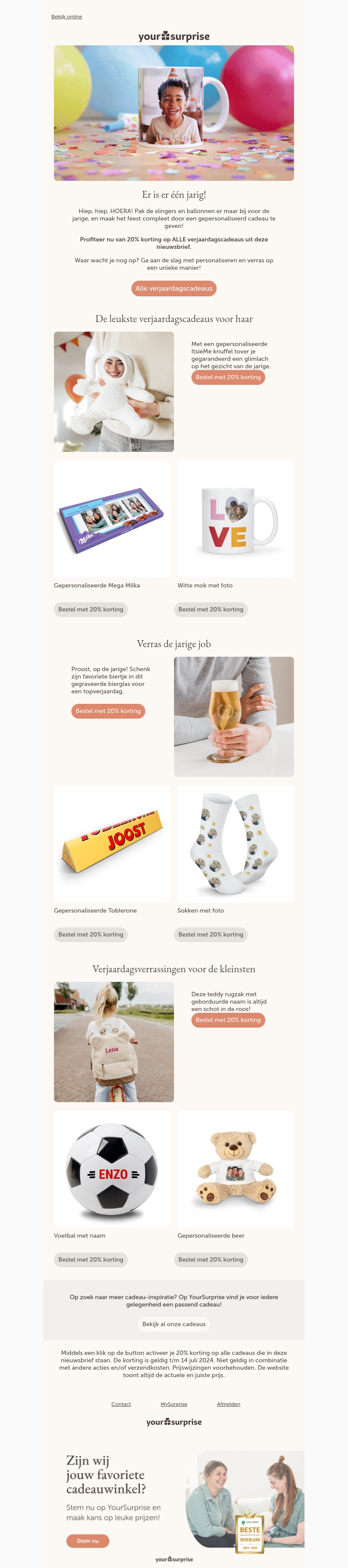 Vier een onvergetelijke verjaardag met onze gepersonaliseerde cadeaus. Of het nu gaat om mokken, chocolade, bierglazen of knuffels, bij YourSurprise vind je het allemaal. Shop nu en krijg 20% korting op alle verjaardagsgeschenken!