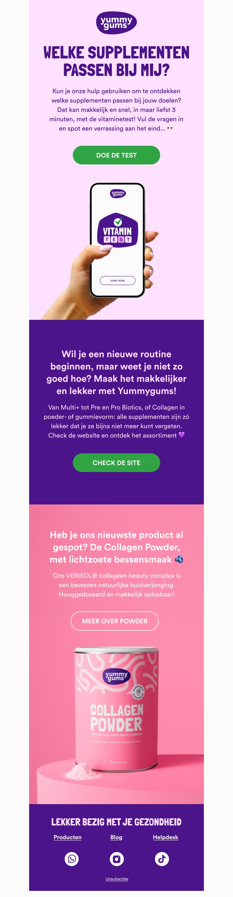 Wil je weten welke supplementen het beste bij jouw doelen passen? Doe de vitaminen test van Yummygums, het duurt slechts 3 minuten! Maak kennis met hun uitgebreide assortiment aan lekkere en gezonde supplementen. Probeer nu ook de nieuwe Collagen Powder met lichtzoete bessensmaak.