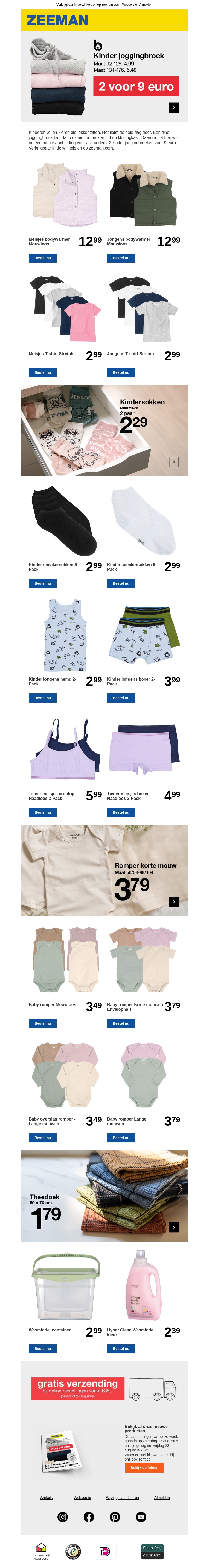 Deze week bieden wij 2 kinder joggingbroeken aan voor slechts €9! Er zijn ook tal van andere aanbiedingen zoals meisjes bodywarmers, jongens t-shirts, en baby rompers. Mis deze kans niet om te besparen op kleding voor je kinderen. Bekijk onze gevarieerde selectie en koop nu!
