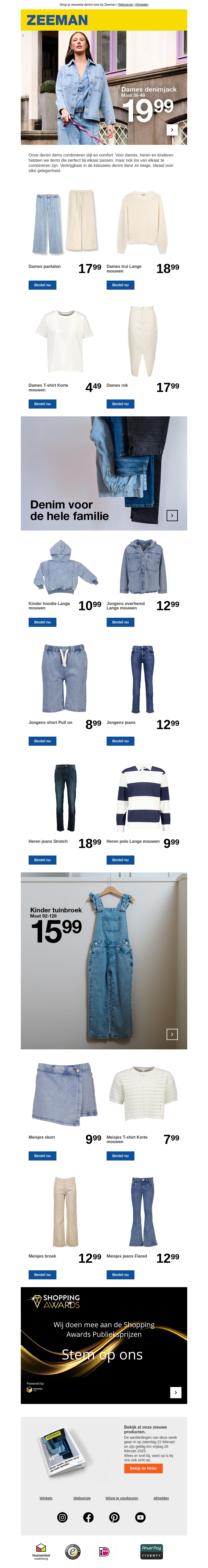 Deze week biedt Zeeman geweldige denim aanbiedingen voor het hele gezin. Van stijlvolle dames denim jassen tot comfortabele heren jeans en vrolijke kinder tuinbroeken. Alle items zijn zorgvuldig geselecteerd voor stijl en comfort. Mis deze koopjes niet en vul je garderobe aan met deze tijdloze stukken. Bezoek onze winkels of shop online voor de beste prijzen.