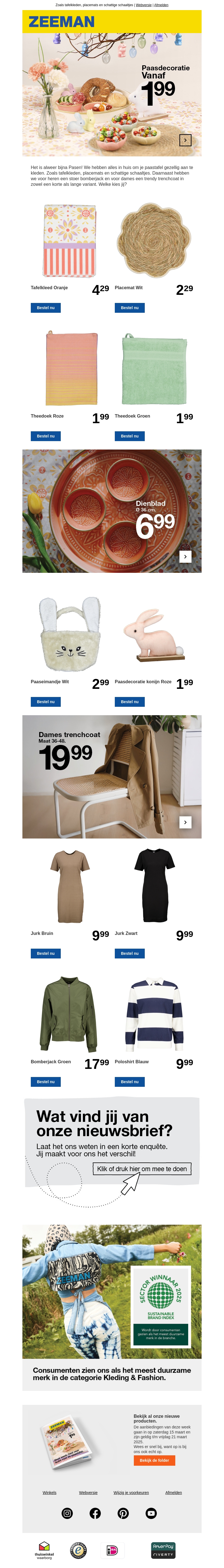 Vier Pasen met stijlvolle decoraties en kleding van Zeeman. Ontdek onze paasdecoraties vanaf slechts 1,99 en kies uit een breed aanbod aan trendy kleding voor dames. Shop vrolijke tafelkleden, theedoeken en meer om jouw paastafel compleet te maken.