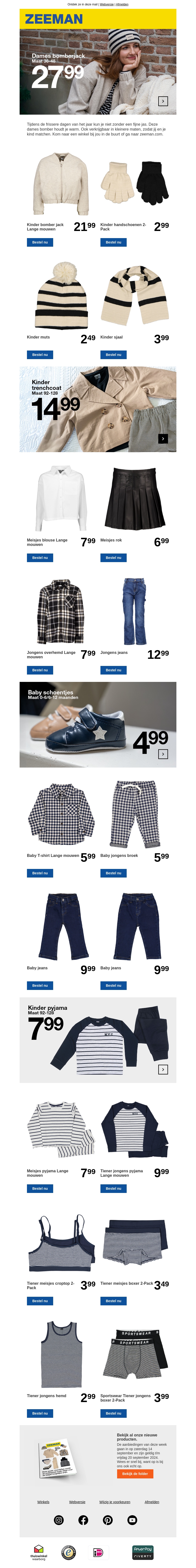 Deze week biedt Zeeman een breed scala aan kledingstukken voor mannen, vrouwen, en kinderen. Van warme winterjassen tot comfortabele kinderpyjama's en stijlvolle accessoires, er is voor elk wat wils. Mis de speciale aanbiedingen niet!