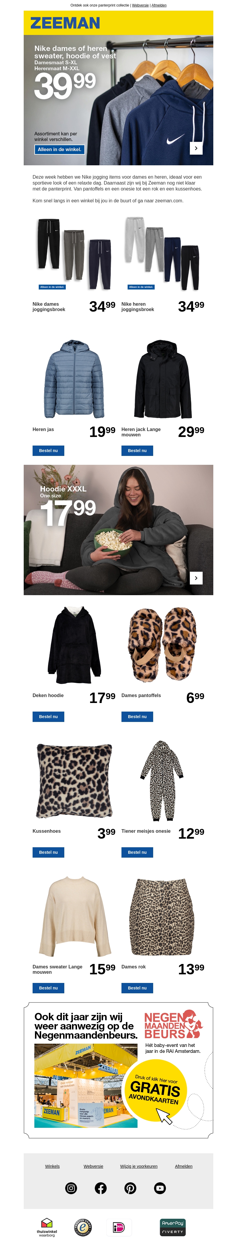 Deze week heeft Zeeman een speciale collectie van Nike jogging items. Of je nu op zoek bent naar comfortabele broeken of stijlvolle hoodies, Zeeman biedt het allemaal. Deze items zijn exclusief verkrijgbaar in de winkel en perfect voor een sportieve look. Zorg dat je snel langsgaat bij een van de Zeeman-winkels in jouw buurt. Mis deze kans niet om je garderobe te upgraden met Nike!
