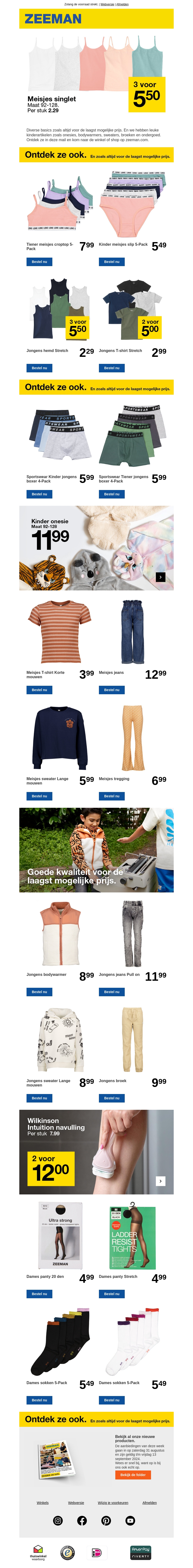 Ontdek de nieuwste collectie bij Zeeman. Van meisjes singlets en jongens boxershorts tot dames panty's en mode accessoires. Profiteer van fantastische deals zoals 3 voor €5,50 en 2 voor €5,00. Kwaliteit voor de laagste prijs!