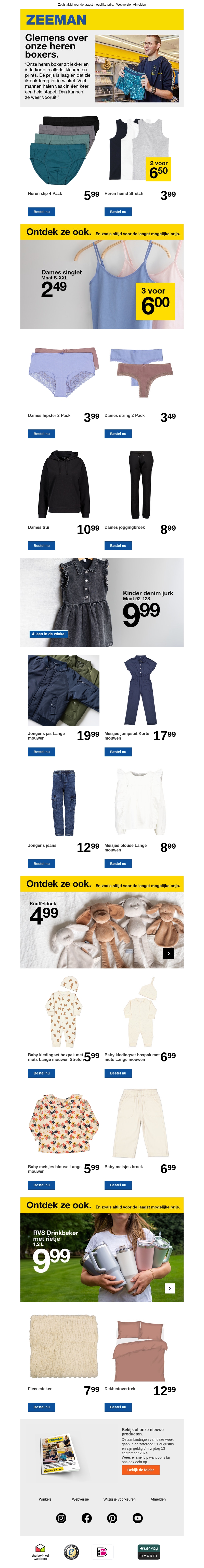 Ontdek de nieuwste heren basics bij Zeeman. Van boxershorts en sokken tot comfortabele kleding, deze nieuwsbrief biedt een uitgebreide selectie aan herenkleding en accessoires. Profiteer van speciale aanbiedingen en scherpe prijzen.