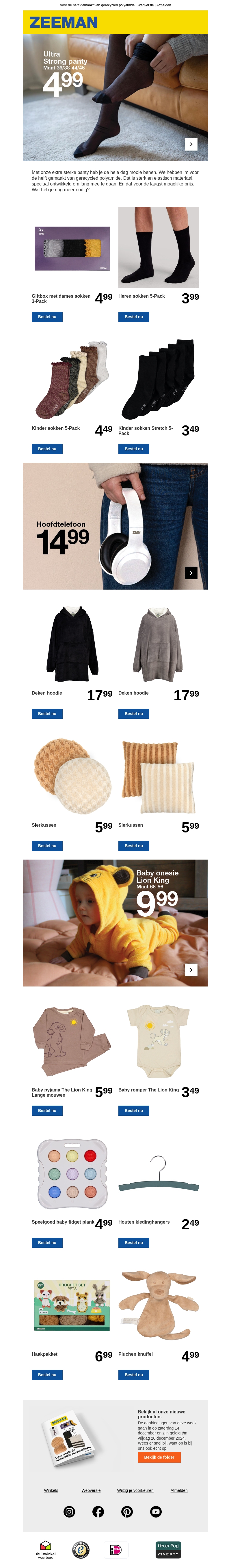 Verwen jezelf met onze extra sterke panty's, die ultiem comfort en duurzaamheid bieden. Deze panty's zijn perfect voor dagelijks gebruik of speciale gelegenheden. Daarnaast zijn er scherpe aanbiedingen voor sokken, warme hoodies en andere accessoires. Ontdek de nieuwste trends en bespaar met onze aantrekkelijke prijzen. Deze nieuwsbrief bevat geen speciale kortingscodes, maar biedt volop inspiratie om je garderobe te vernieuwen.