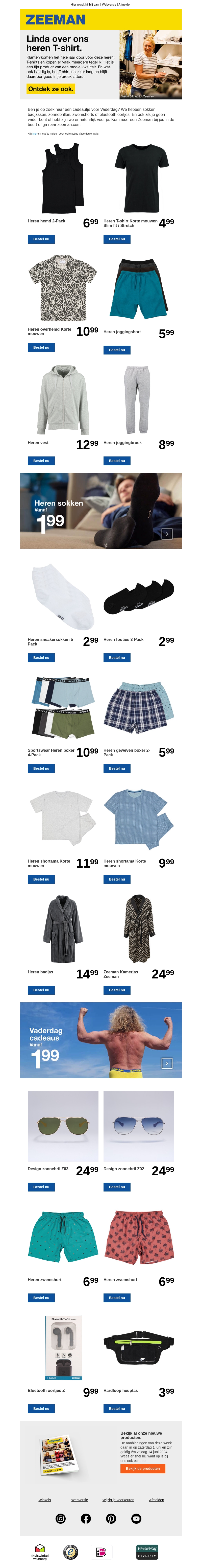 Kijk naar onze nieuwste collectie herenmode bij Zeeman. Van comfortabele T-shirts en vesten tot functionele ondergoed en zwembroeken. Vind het perfecte Vaderdag cadeau vanaf €1,99!