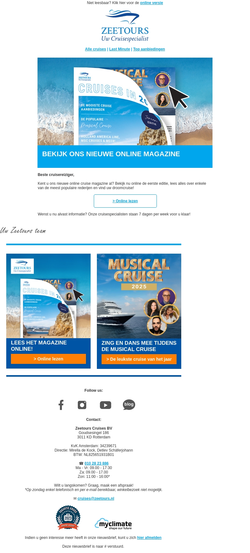 Maak kennis met ons nieuwste online cruise-magazine. Ontdek de populairste rederijen en droomcruises in onze eerste editie. Perfect voor vakantie-inspiratie en informatie over Holland America Line en MSC Cruises.