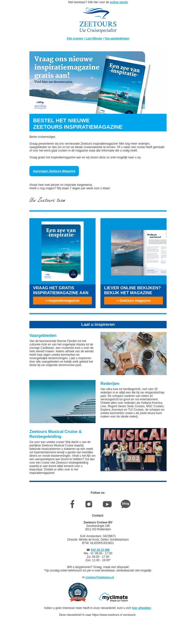 De nieuwe editie van het Zeetours Inspiratiemagazine is nu beschikbaar en volledig gratis te bestellen. Het magazine biedt een schat aan informatie en inspiratie voor zowel beginnende als doorgewinterde reizigers. Met tips over cruisebestemmingen en maatschappijen helpt het u bij het plannen van uw volgende avontuur. Vraag vandaag nog uw exemplaar aan en laat u inspireren om uw droomcruise te vinden. Zeetours staat klaar om al uw vragen te beantwoorden. Doe uzelf een plezier en ontdek het vandaag nog!