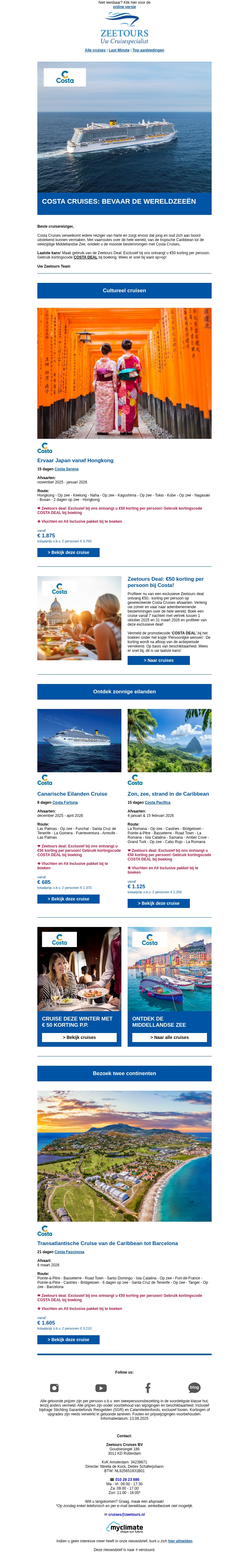 Bevaar de wereldzeeën met Costa Cruises