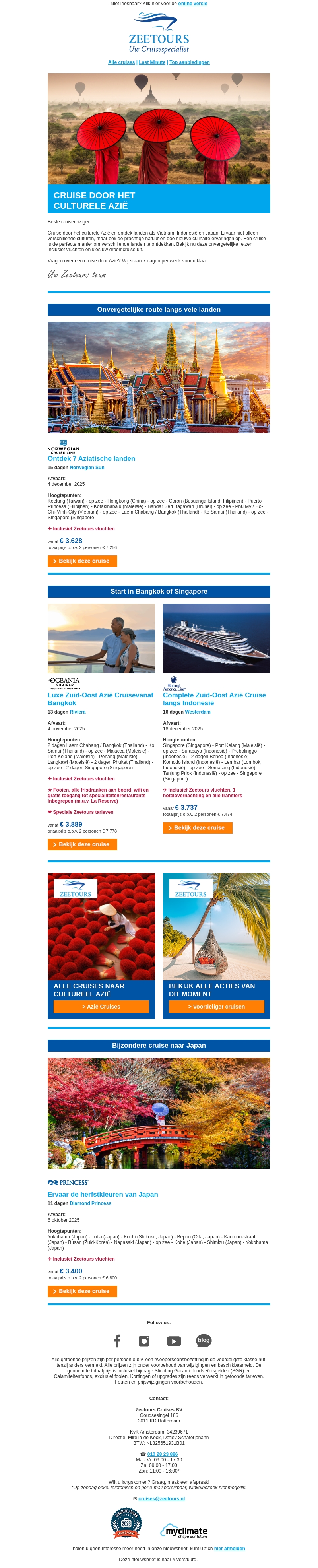 Beleef een onvergetelijke cruise door het culturele Azië met Zeetours. Ontdek prachtige landen zoals Vietnam, Indonesië, en Japan. Geniet van luxe accommodaties, culinaire hoogstandjes en culturele excursies. Boek nu uw avontuur aan boord van gerenommeerde cruiseschepen. Exclusieve aanbiedingen en kortingen beschikbaar. Laat u betoveren door de schoonheid van Azië.