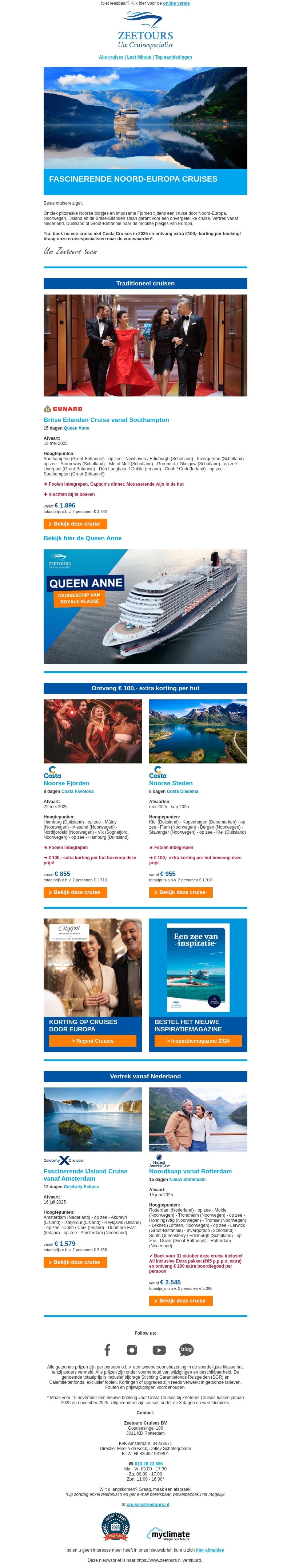 Verken de fascinerende landschappen van Noord-Europa met onze exclusieve cruises van ZeeTours. Ervaar een onvergetelijke reis langs majestueuze fjorden en historische steden vanuit Rotterdam of Southampton. Profiteer nu van speciale kortingen. Bekijk ons uitgebreide aanbod en ontdek uw droomcruise!