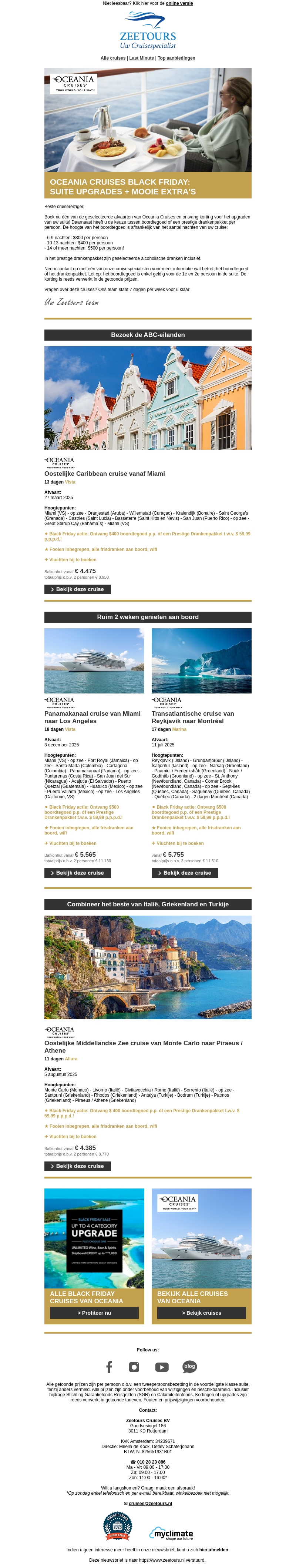 Mis de kans niet om te profiteren van exclusieve Black Friday deals bij Oceania Cruises. Verwen uzelf met gratis suite upgrades en extra voordelen. Ontdek prachtige bestemmingen zoals de ABC-eilanden, de Middellandse Zee en meer. Nu is het moment om uw droomcruise te boeken met deze speciale aanbiedingen.