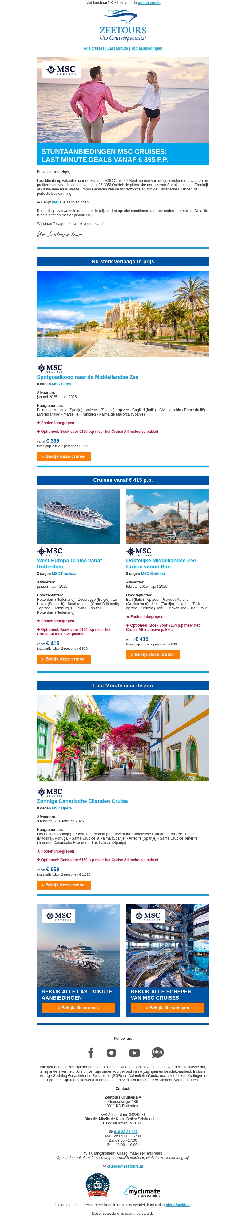 Laat je meevoeren op een onvergetelijke reis met de last minute deals van MSC Cruises. Vanaf slechts €395 p.p. kun je genieten van prachtige bestemmingen zoals de Middellandse Zee en West-Europa. Boek nu en profiteer van speciale aanbiedingen en voordelige prijzen.