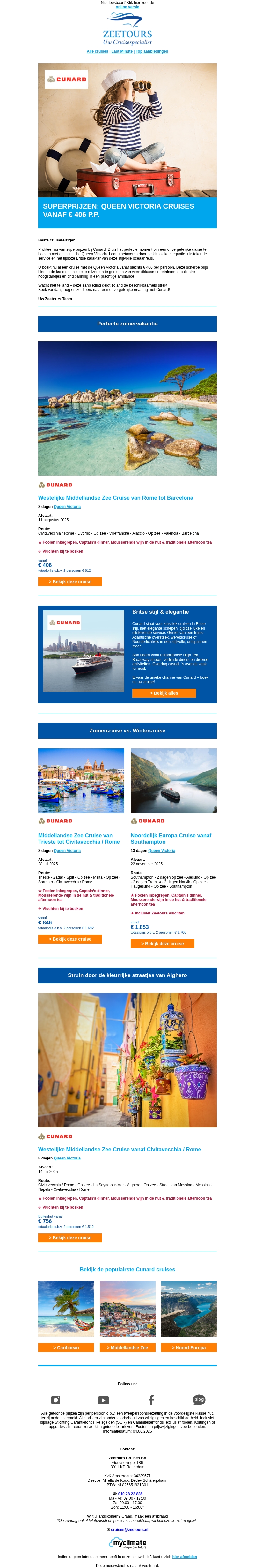 Superprijzen: Queen Victoria cruises vanaf € 406 p.p.