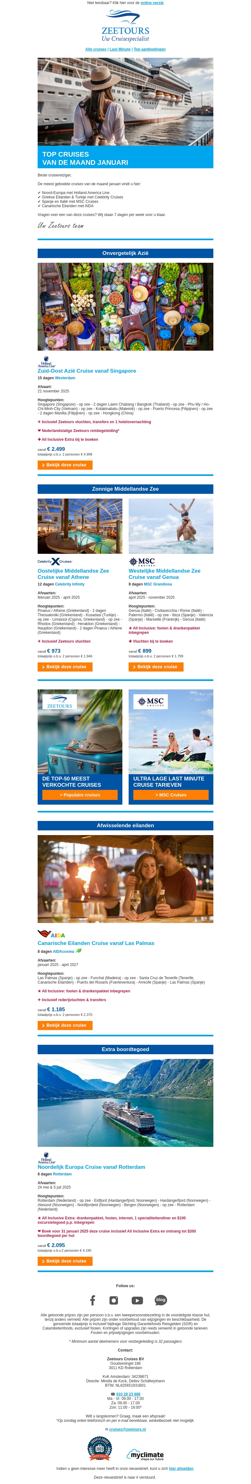 Verken de wereld met de meest luxe cruises van de maand januari. Van Azië tot aan de Middellandse Zee, jouw ideale vakantie wacht. Geniet van aantrekkelijke prijzen en unieke bestemmingen. Boek vandaag en maak jouw droomcruise werkelijkheid. Kies uit onze selectie voor een onvergetelijke reiservaring.
