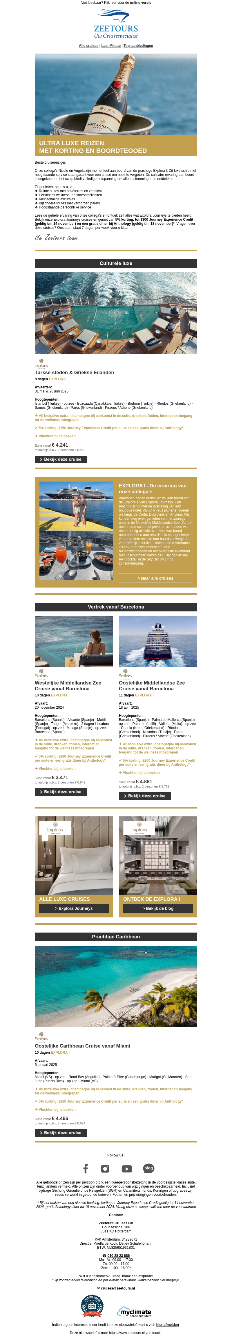 Verken de wereld in stijl met Explora Journey, waar luxe en avontuur samenkomen. Geniet van speciale kortingen en ontvang extra boordtegoed voor een onvergetelijke reis. Kies uit verbluffende bestemmingen zoals de Griekse Eilanden en de Caribbean. Boek nu en beleef een unieke vakantie-ervaring!