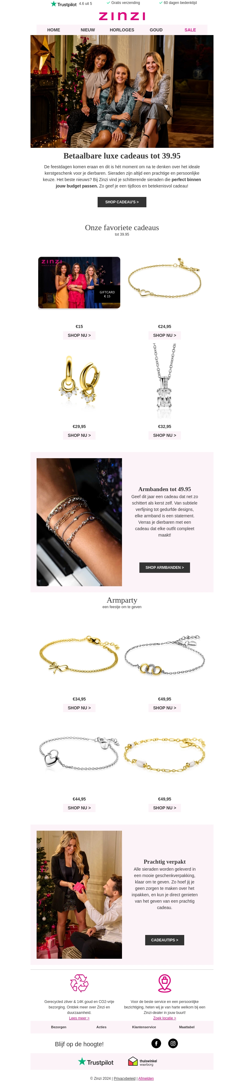 Ontdek onze luxe cadeaus tot €39,95, perfect voor de feestdagen. Of je nu op zoek bent naar een betekenisvol geschenk of een stijlvolle toevoeging aan je collectie, wij hebben het ideale product. Bekijk onze nieuwste collectie sieraden en vind de perfecte match voor elke gelegenheid. Geniet van gratis verzending en 60 dagen bedenktijd. Mis het niet: deze aanbiedingen zijn tijdloos en vol betekenis. Shop nu en maak jouw feestdagen onvergetelijk!