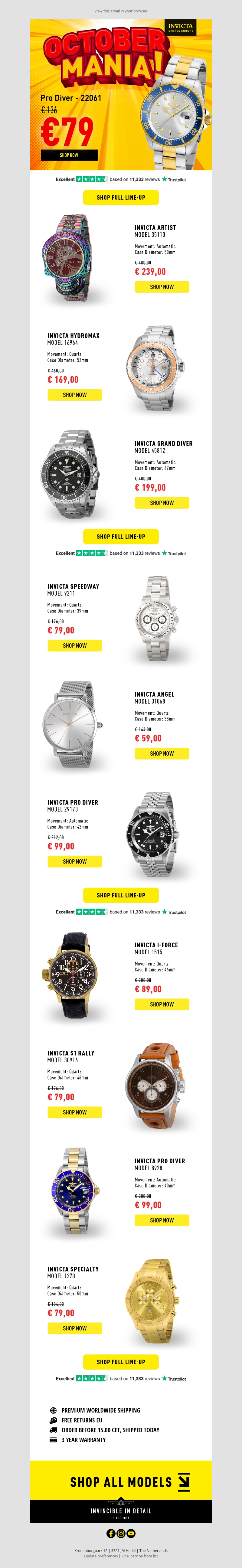 Ontdek ongelooflijke aanbiedingen in onze 'Oktober Mania' promotie met Invicta horloges. Profiteer van aanzienlijke kortingen op populaire modellen zoals de Pro Diver en Artist. Tijdloze stijl, hoge kwaliteit en betaalbare prijzen komen samen in deze maandelijkse actie. Hoge klantbeoordelingen bevestigen de waarde en betrouwbaarheid van deze horloges. Gratis verzending, eenvoudige retouren en een driejarige garantie geven een zorgeloze winkelervaring. Mis deze unieke kans niet om uw klokcollectie uit te breiden.
