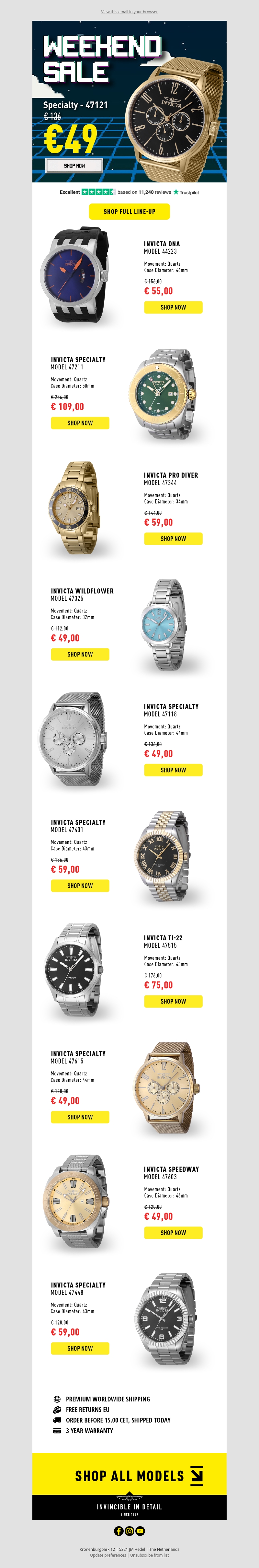 Profiteer van onze Weekend Sale met enorme kortingen op verschillende bestverkopende Invicta horloges. Sla je slag nu en bespaar op hoogwaardige tijdloze horloges. Bekijk onze complete line-up en vind jouw perfecte fit.