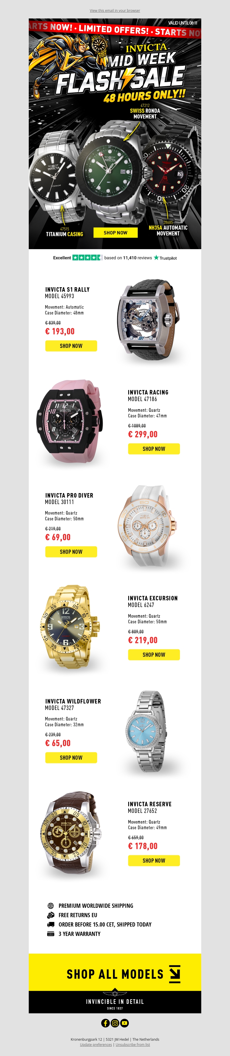 Mis deze kans niet om enorme besparingen te scoren met de Invicta Flash Sale. Ontdek luxe horloges met geweldige kortingen, slechts 24 uur lang geldig. Kies uit populaire modellen zoals de Invicta S1 Rally en Invicta Pro Diver. Profiteer van wereldwijde verzending en gratis retouren binnen de EU. Het aanbod geldt alleen vandaag.