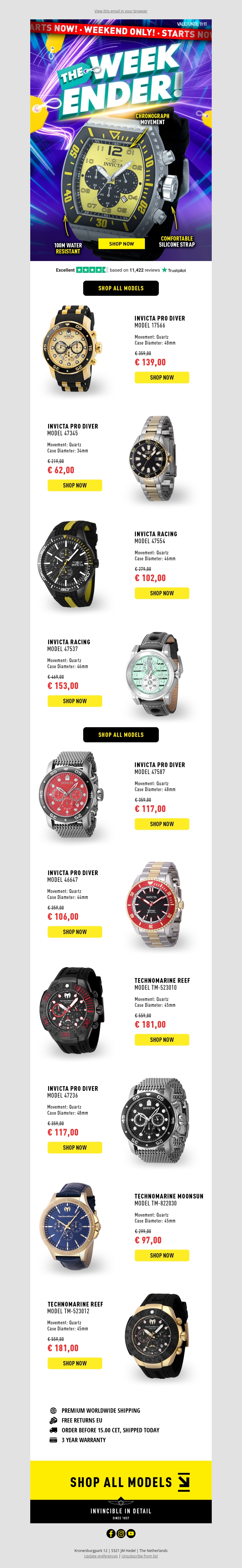 Profiteer van de laatste kans op geweldige kortingen met Invicta's weekend deals. Ervaar de luxe en duurzaamheid van Invicta horloges tegen ongekende prijzen. Ontdek modellen als de Invicta Pro Diver en Racing in diverse stijlen en kleuren. Elke aankoop komt met wereldwijde verzending, gratis retouren binnen de EU, en 1 jaar garantie. Shop nu en upgrade je stijl voordelig.